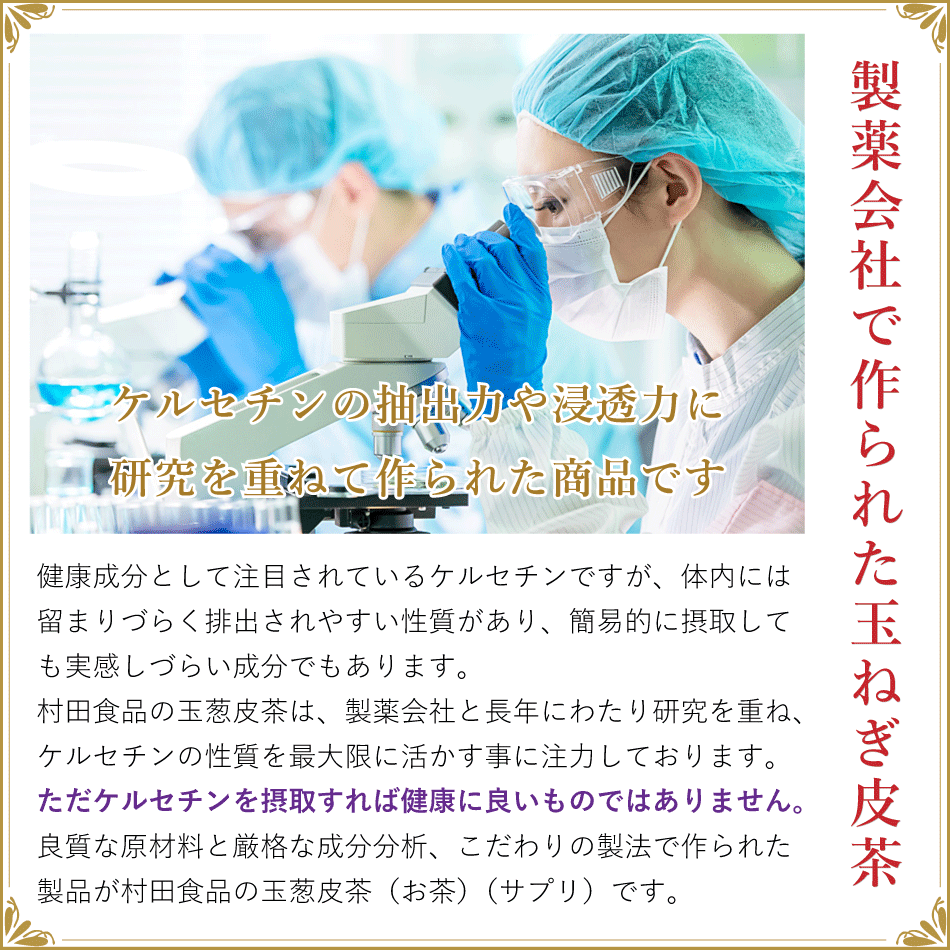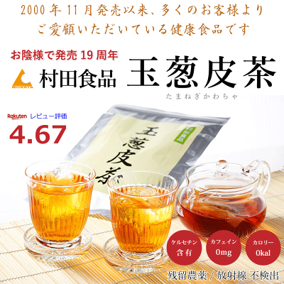 >>レビューを見る※ご利用者様のご感想 玉ねぎ茶:1袋30包通常価格:2,980円 玉ねぎ茶:6袋セットセット価格:16,200円 玉ねぎ茶:定期定期コース価格 商品名 村田食品の玉葱皮茶ティーパックタイプ 内容量 (1袋:1.2g×30包)×3袋 お客様の声 >>レビューを見る 健康成分 >>ケルセチン配糖体 ケルセチンでも糖と結合したケルセチン配糖体であり、体内への浸透力に優れたグルコースと結合した成分です 原材料 玉ねぎの皮100%※残留農薬・放射線検査は製造ロット毎に検査済み 成分表 エネルギー:0kcal/たんぱく質:0g/脂質:0g/炭水化物:0g/ナトリウム:0g/ケルセチン含有 広告分析 会社名:有限会社村田食品 TEL:042-777-7531(0120-66-7531) 製造元:株式会社アダプトゲン製薬 原産国:国産 北海道 区分 :健康食品 健康茶 お茶 商品説明 村田食品の玉葱皮茶は、国産(北海道の北見地方限定)玉ねぎの皮を100%使用したケルセチン含有の健康食品となります。