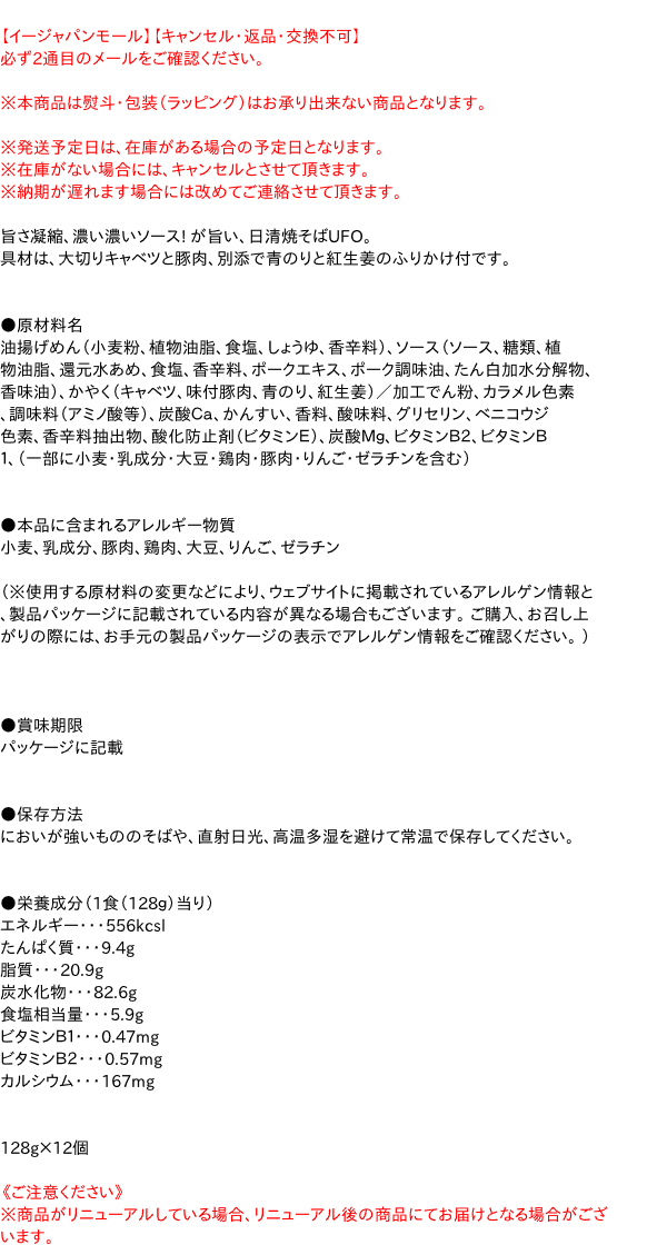 ●栄養成分(1食(128g)当り) エネルギー・・・556kcsl たんぱく質・・・9.4g 脂質・・・20.9g 炭水化物・・・82.6g 食塩相当量・・・5.9g ビタミンB1・・・0.47mg ビタミンB2・・・0.57mg カルシウム・・・167mg 128g×12個【メーカー・製造または販売元】日清食品株式会社0120-923-301【広告文責】株式会社イージャパンアンドカンパニーズ 072-875-6666《ご注意ください》 ※本商品はキャンセル・返品・交換不可の商品です。