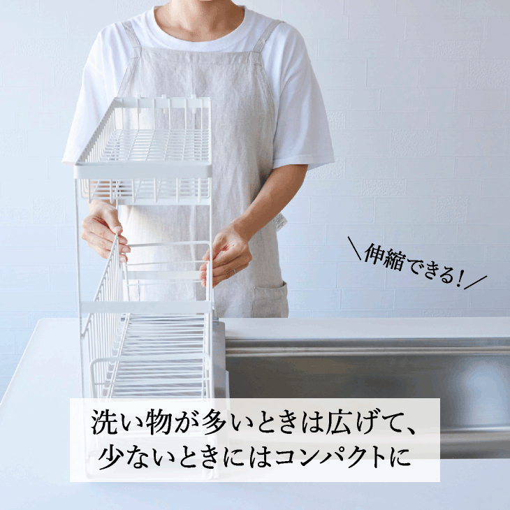 ・キッチンの限られたスペースを広々使える伸縮式2段水切りラック。